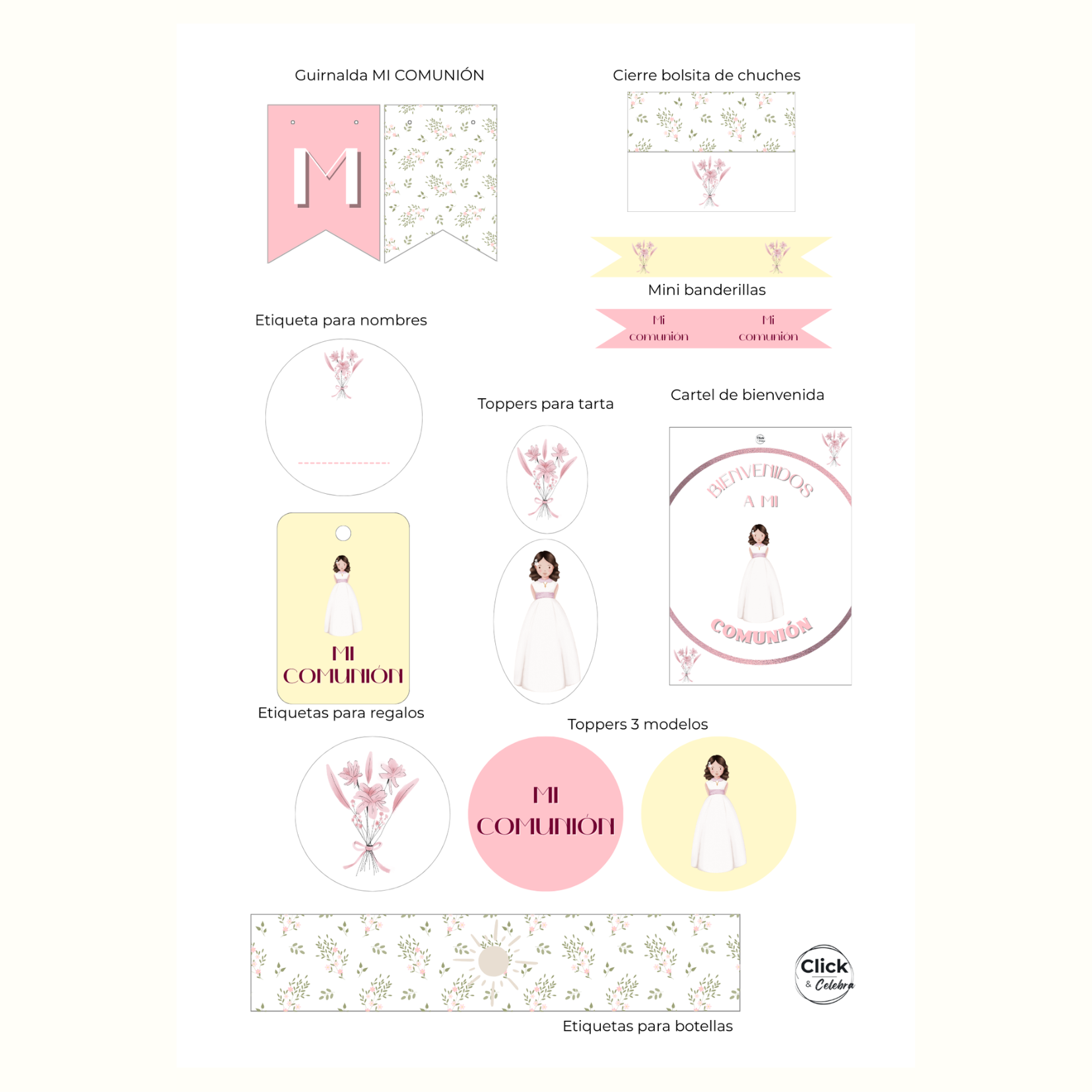 Incluye todo lo necesario para decorar la celebración con un estilo floral delicado y atemporal: guirnalda, toppers, cartel de bienvenida, etiquetas para recuerdos, cierres de bolsitas y mucho más.
