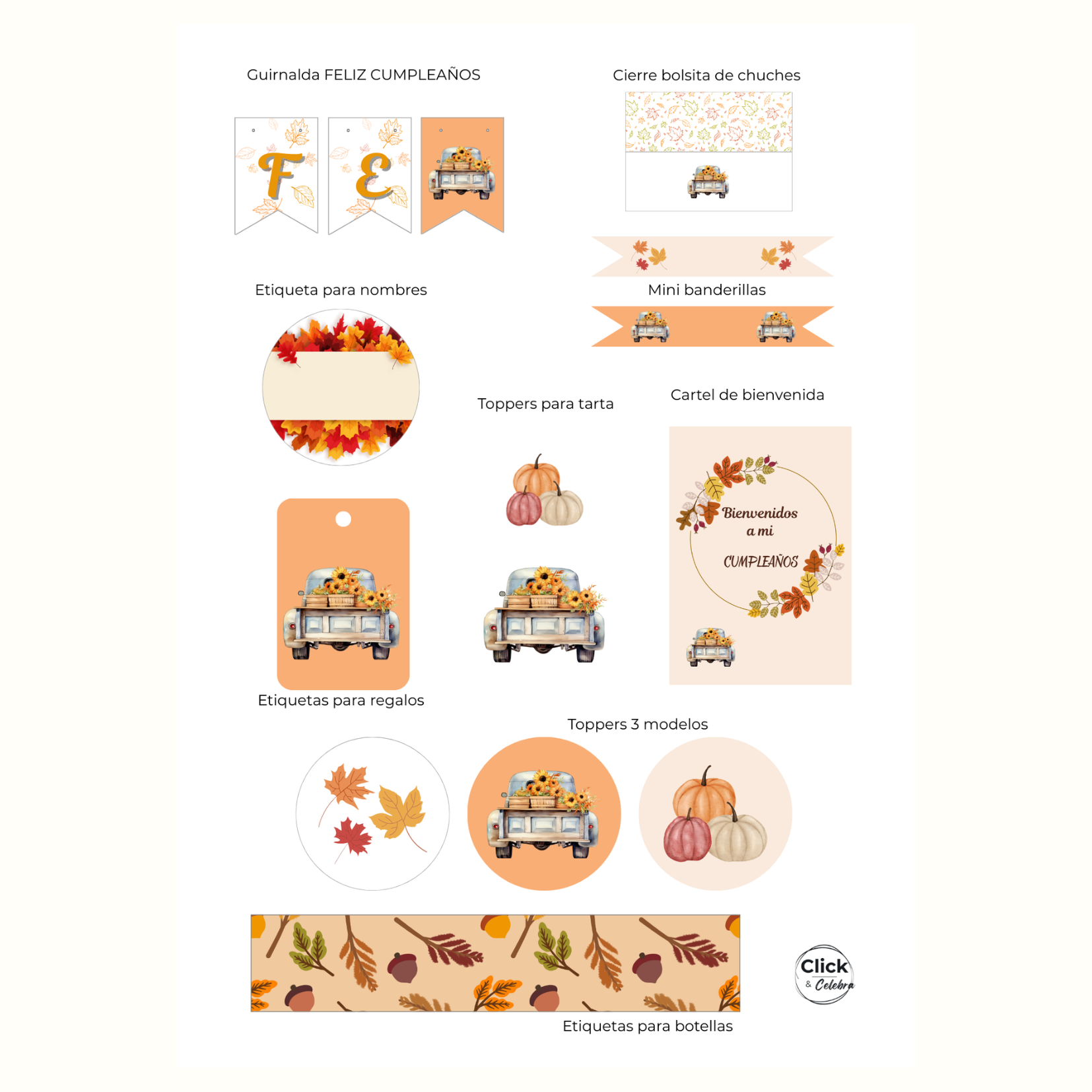 Con este kit imprimible tendrás todo lo necesario para llenar tu fiesta de la magia de la temporada: hojas, calabazas y colores cálidos que transforman cualquier espacio en un ambiente acogedor y festivo. Solo descarga, imprime y disfruta de una celebración única y llena de detalles especiales.
